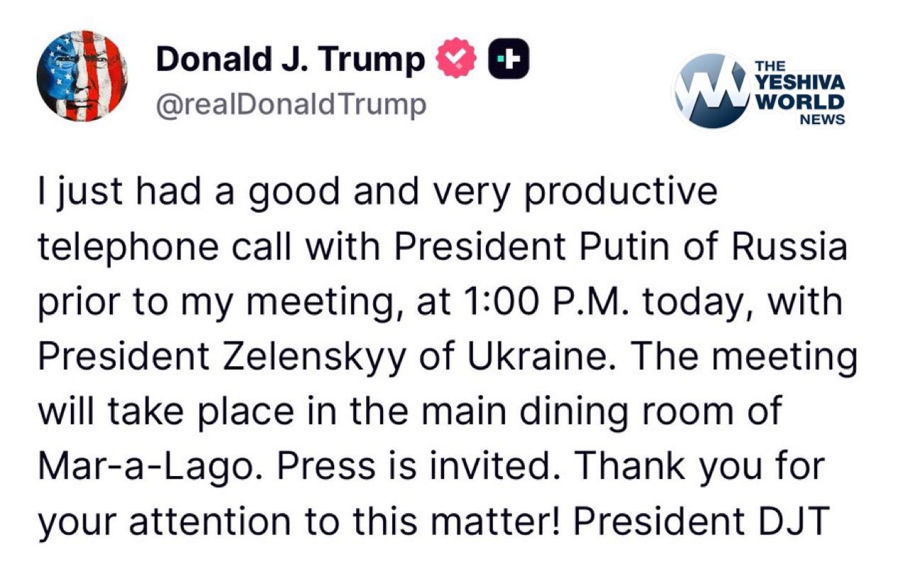 TRUMP: I just had a good and very productive telephone call with President Putin of Russia prior to my meeting, at 1:00 PM today, with President Zelenskyy of Ukraine. The meeting will take place in the main dining room of Mar-a-Lago. Press is invited. Thank you for your attention to this matter! President DJT