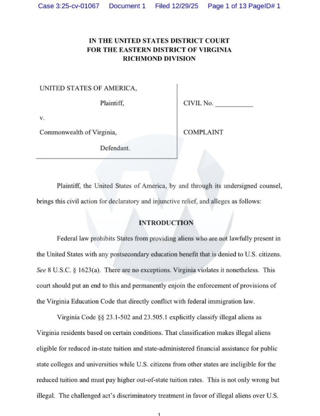 The Trump administration filed a lawsuit Monday against Virginia, aiming to block a policy that allows undocumented immigrants to receive in-state tuition at the University of Virginia, court records show.