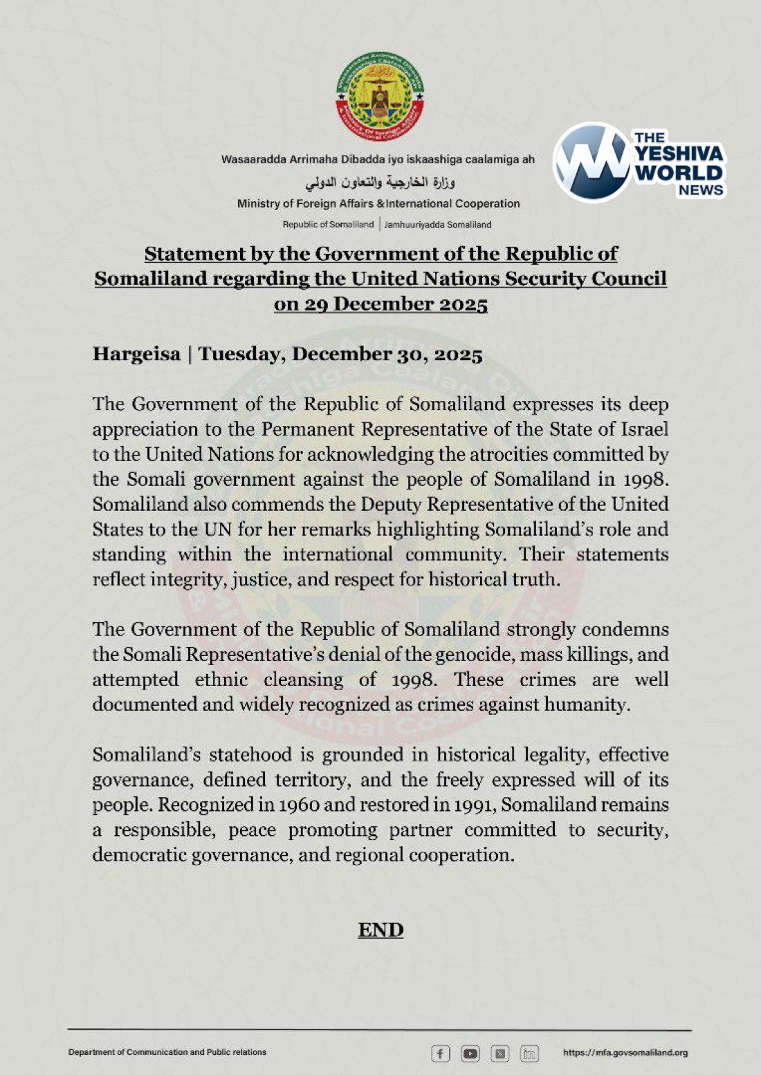 The Somaliland government praised Israeli and U.S. officials at the United Nations for recognizing the 1998 atrocities and criticized Somalia for denying them.
