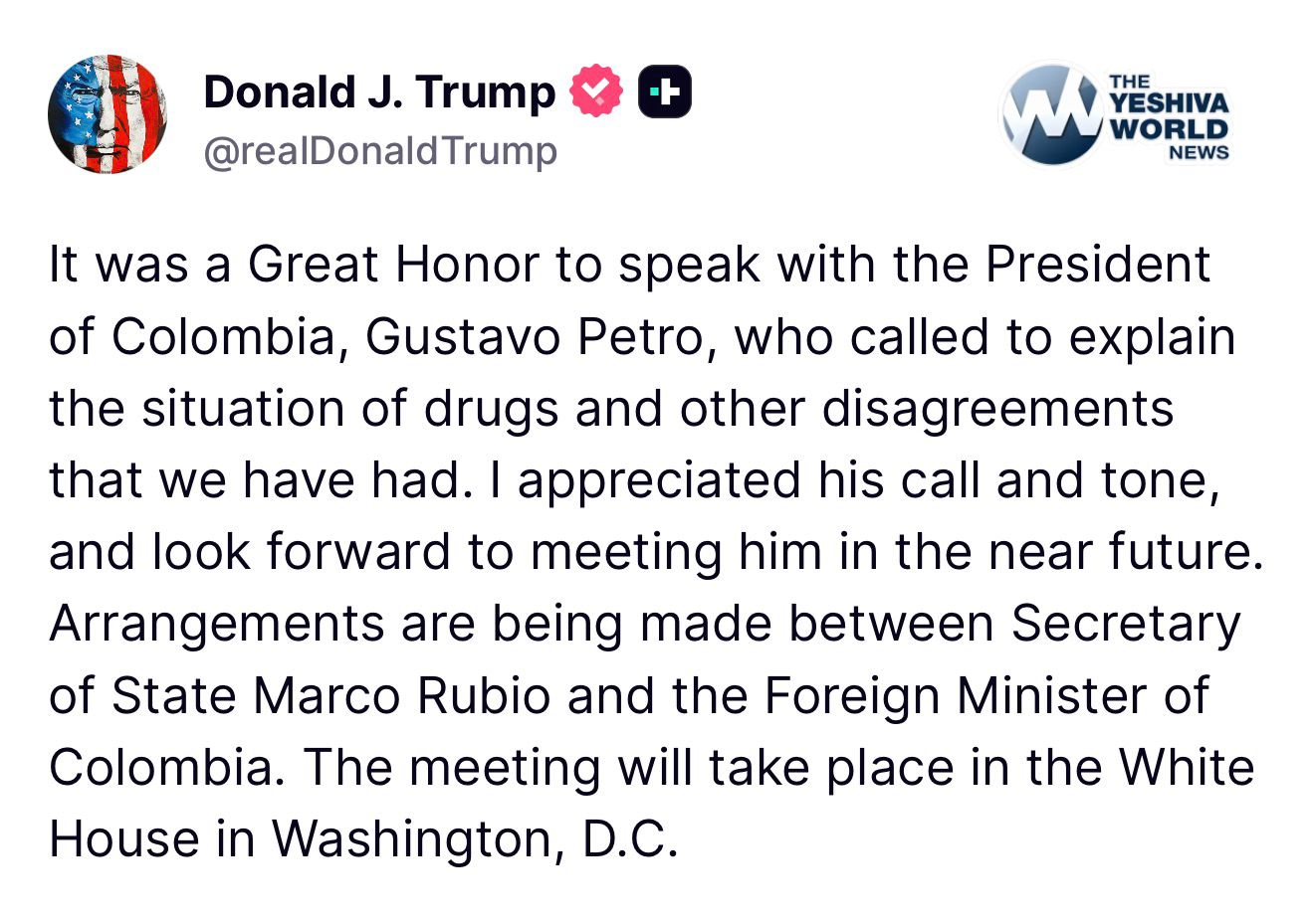 TRUMP: It was a Great Honor to speak with the President of Colombia, Gustavo Petro, who called to explain the situation of drugs and other disagreements that we have had. I appreciated his call and tone, and look forward to meeting him in the near future. Arrangements are being made between Secretary of State Marco Rubio and the Foreign Minister of Colombia. The meeting will take place in the White House in Washington, D.C.