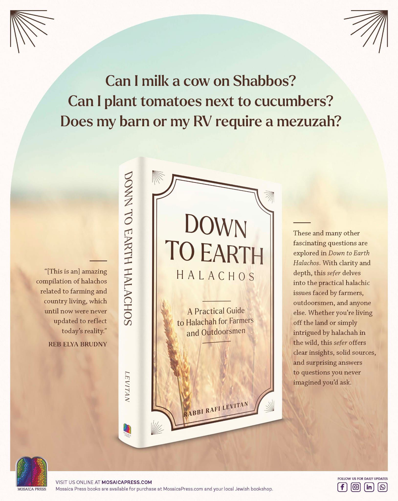 Down to Earth Halachos addresses real shailos that come up in frum homes, farms, and outdoor settings — practical guidance, clearly explained and rooted in halachah.