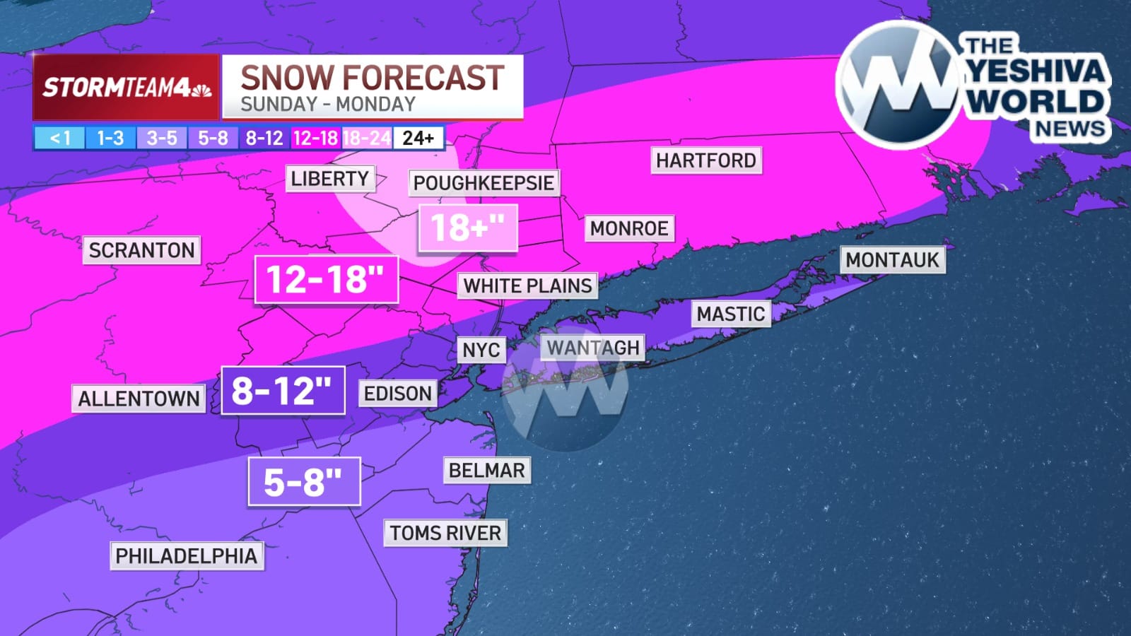 Areas well north and west of New York City could see accumulations of a foot or more of snow, potentially reaching 18 inches, with bullseye regions including northwestern New Jersey, the Hudson Valley and eastern Pennsylvania. The area around the city and Long Island, as well as much of New Jersey, could land in the 8-to-12-inch range.
