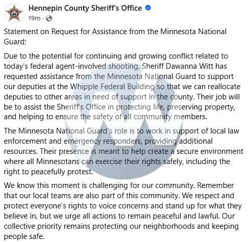 Hennepin County, MN Sheriff requests assistance from the Minnesota National Guard
