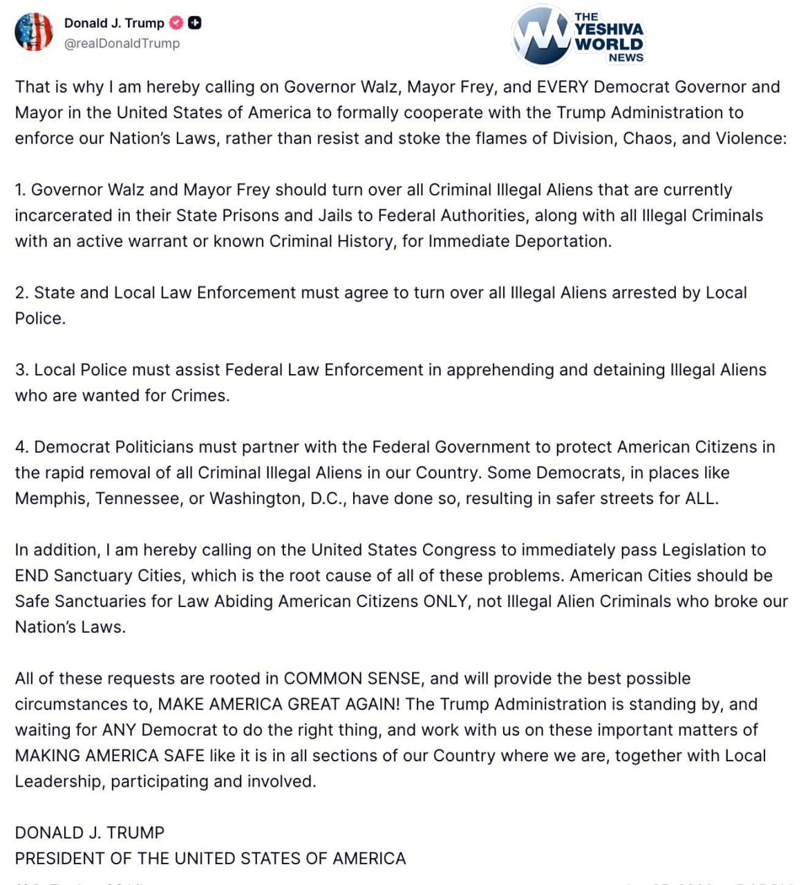 TRUMP: That is why I am hereby calling on Governor Walz, Mayor Frey, and EVERY Democrat Governor and Mayor in the United States of America to formally cooperate with the Trump Administration to enforce our Nation’s Laws, rather than resist and stoke the flames of Division, Chaos, and Violence.