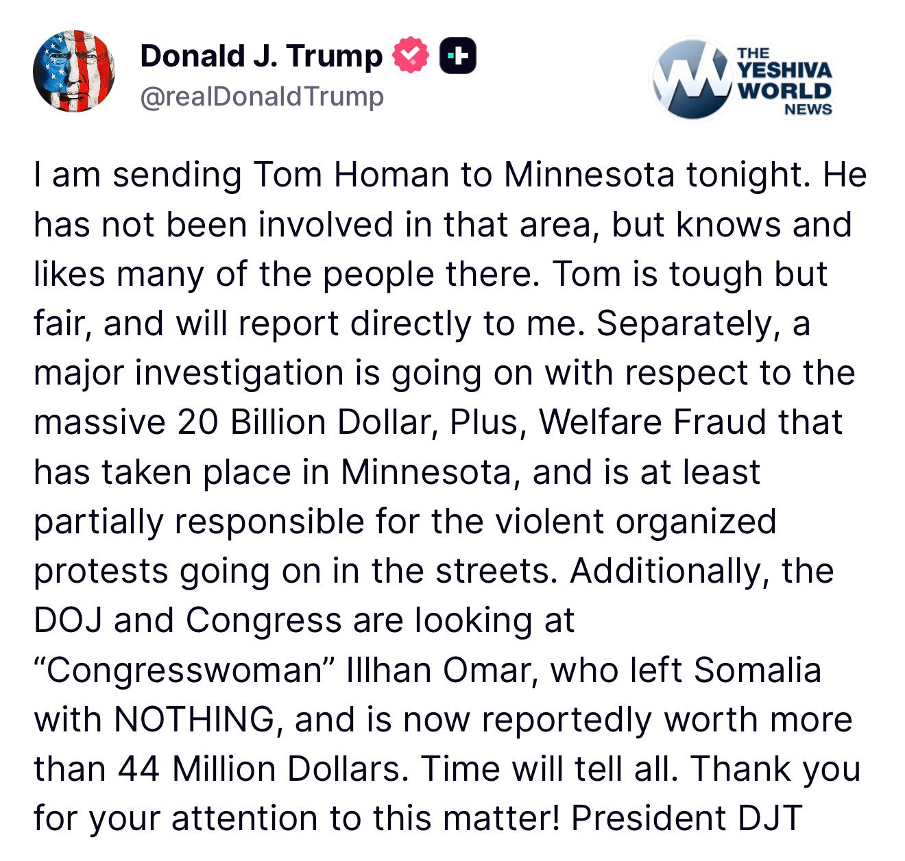 President Trump Said He is Sending Tom Homan to Minnesota Tonight
