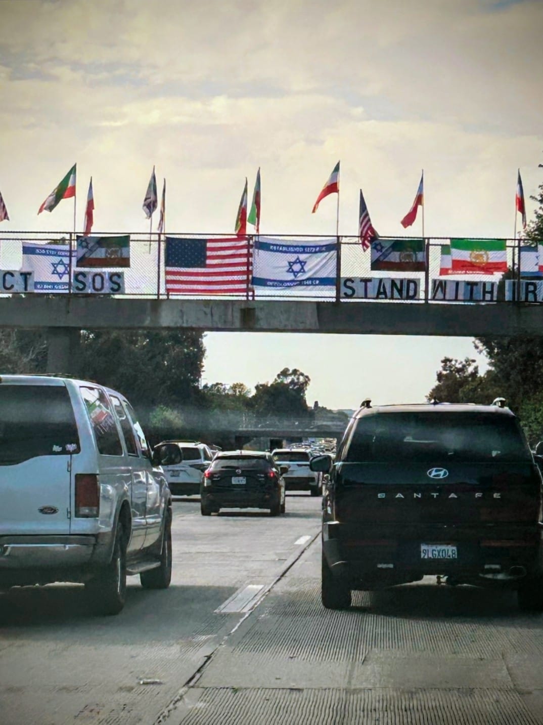 🇮🇱🇮🇷 Anti-Iranian regime, pro-Israel flags placed on an overpass over the 101 Freeway in Encino, California, this afternoon.