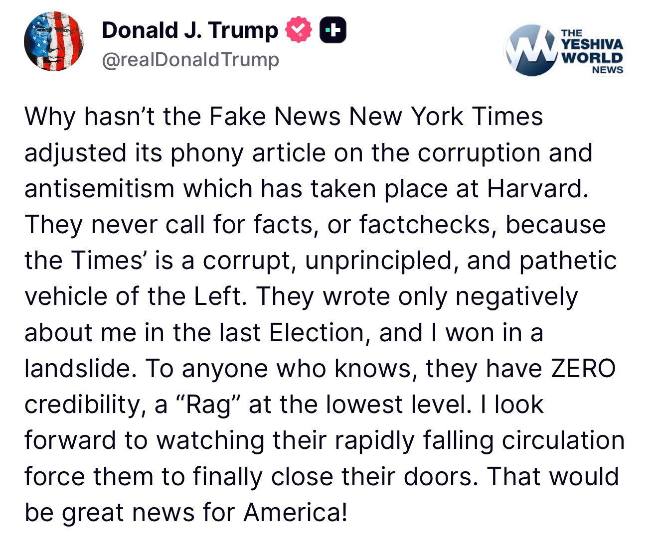 TRUMP: Why hasn’t the fake news New York Times adjusted It’s phony article on the corruption and antisemitism which has taken place at Harvard. They never call for facts or factchecks, because the Times’ is a corrupt, unprincipled, and pathetic vehicle of the left. I look forward to watching their rapidly falling circulation, force them to finally close their doors. That would be great news for America!