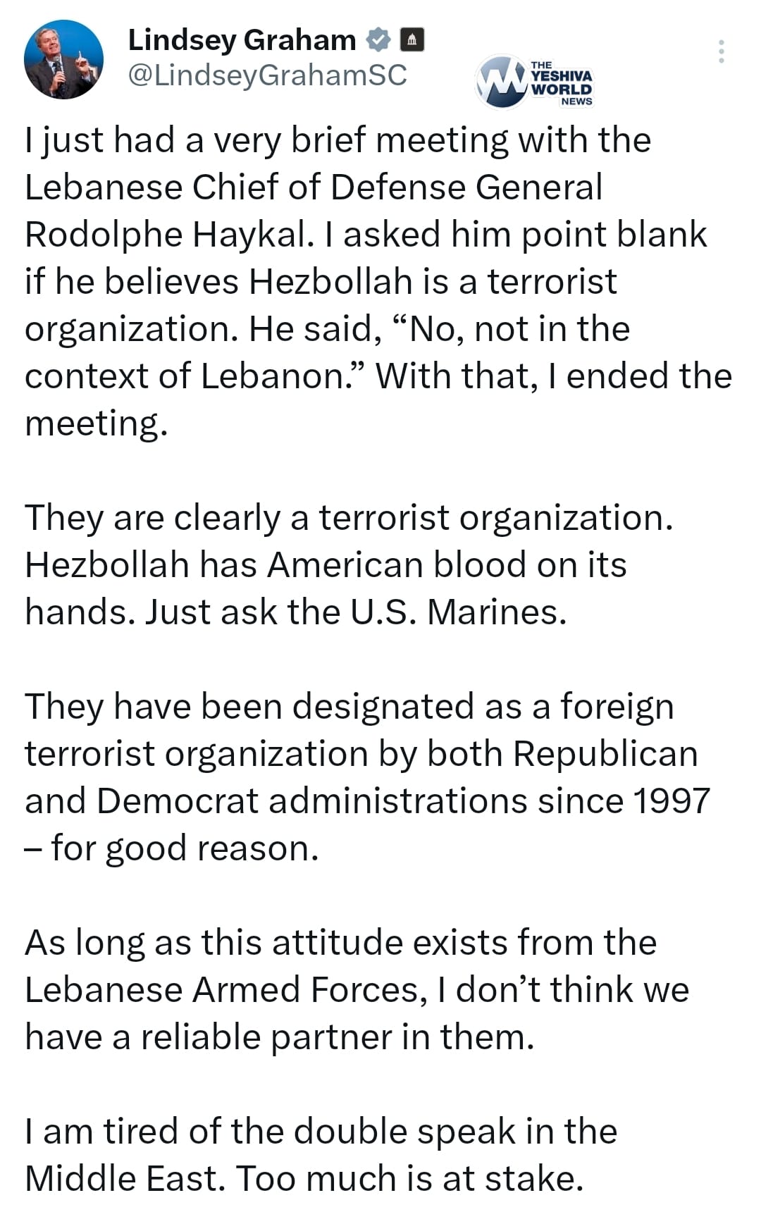 Senator Lindsey Graham: I just had a very brief meeting with the Lebanese Chief of Defense General Rodolphe Haykal.