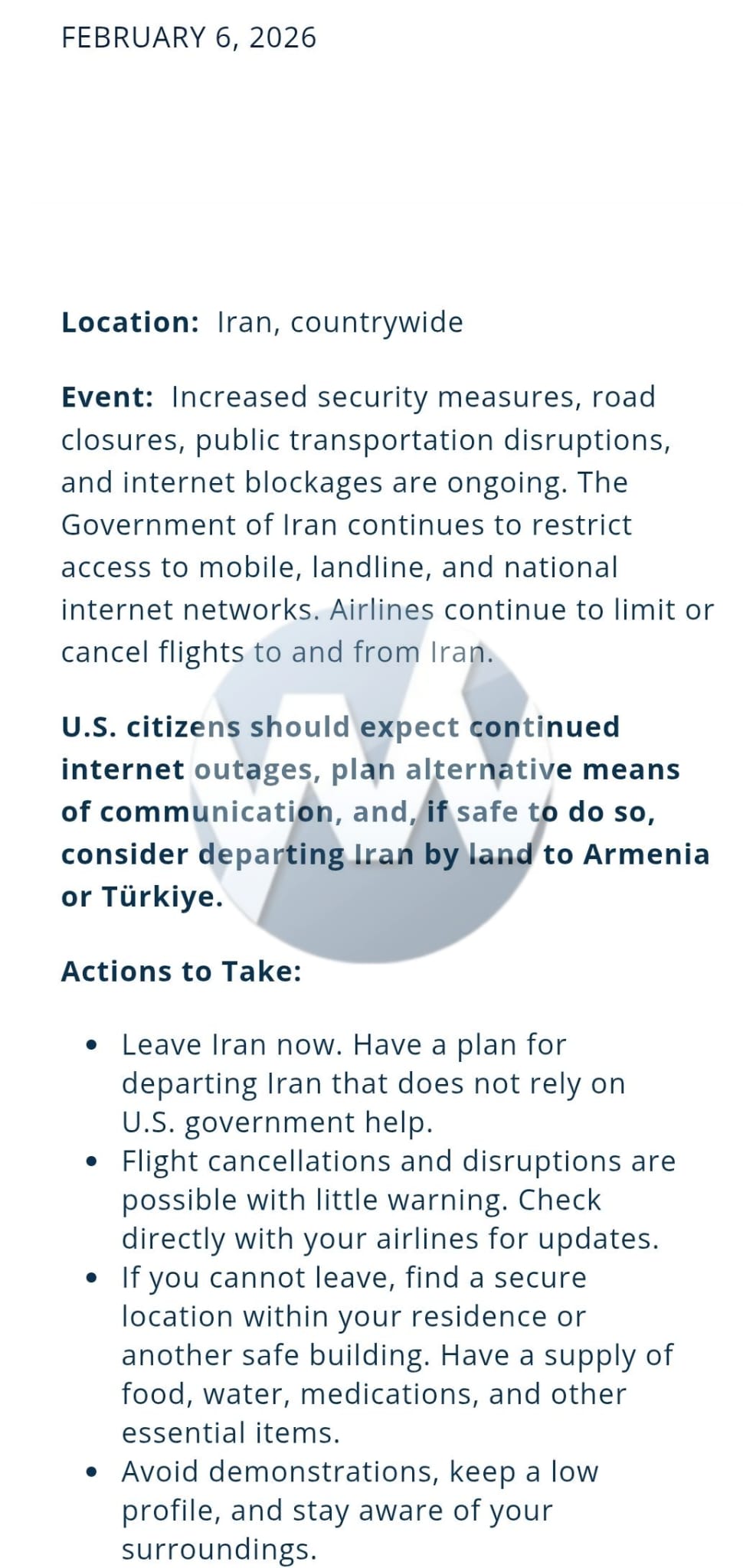 The State Department issued another travel warning urging U.S. citizens currently in Iran to expect continued internet outages and, if safe to do so, consider departing the country, including by land routes.