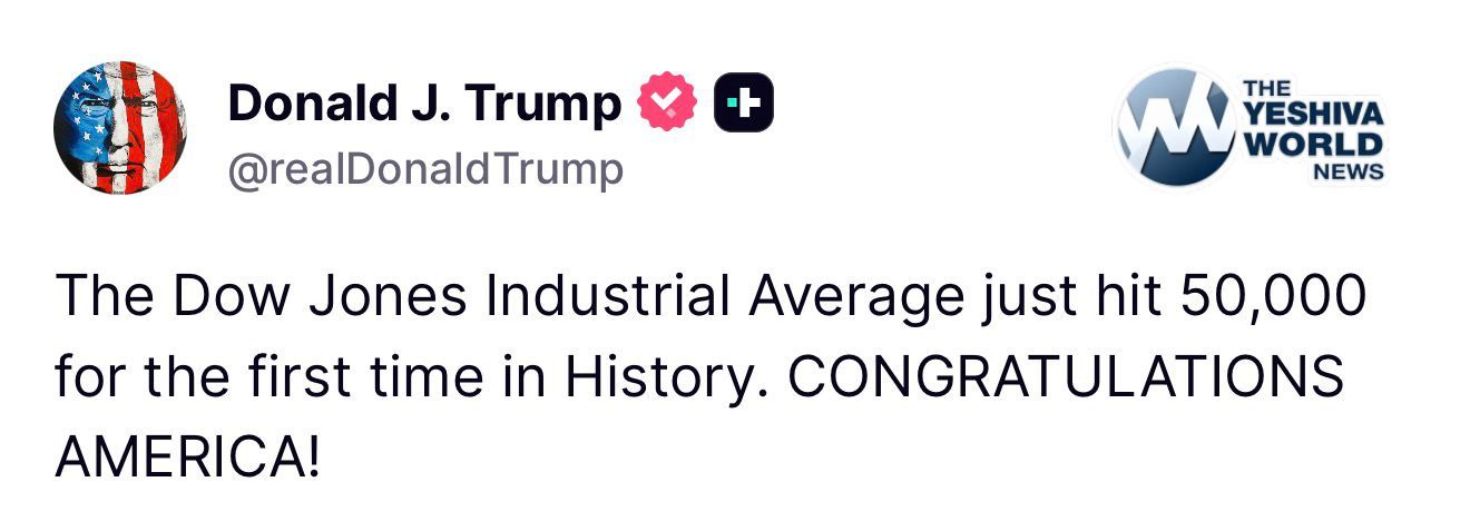 TRUMP: The Dow Jones Industrial Average just hit 50,000 for the first time in history. CONGRATULATIONS AMERICA!