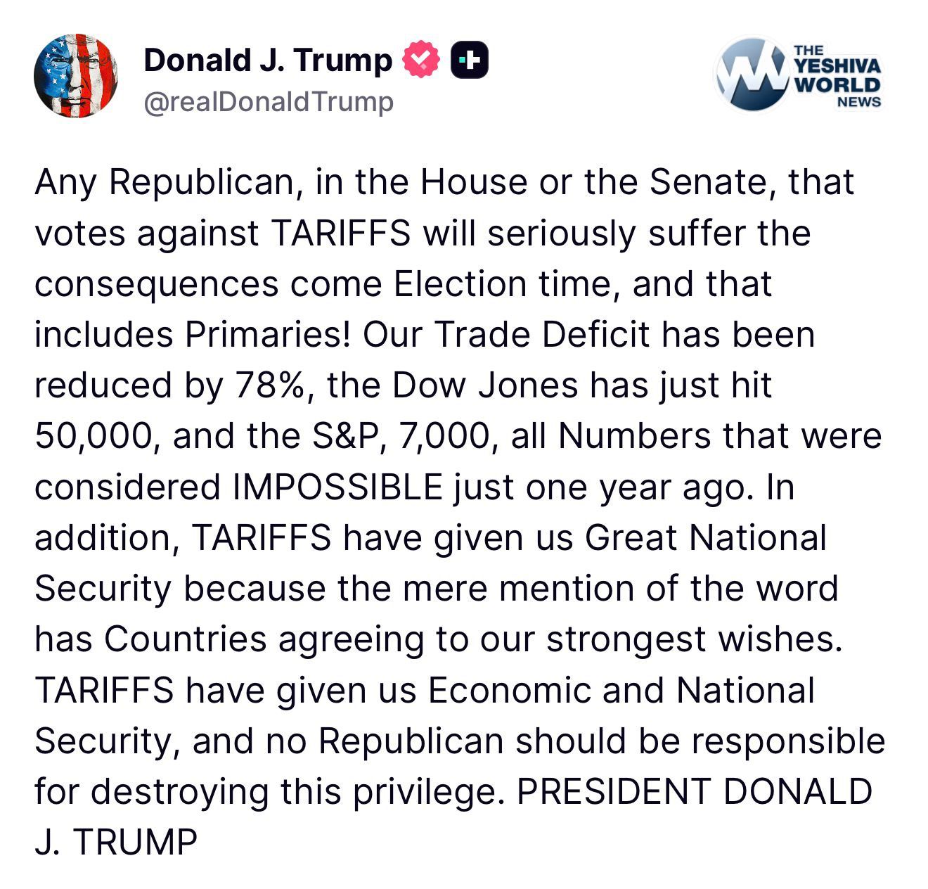 🚨 TRUMP: Any Republican, in the House or or the Senate, that votes against TARIFFS will seriously suffer the consequences come Election time, and that includes Primaries! Our Trade Deficit has been reduced by 78%, the Dow Jones has just hit 50,000, and the S&P, 7,000, all Numbers that were considered IMPOSSIBLE just one year ago. In addition, TARIFFS have given us Great National Security, because the mere mention of the word has Countries agreeing to our strongest wishes. TARIFFS have given us Economic and National Security, and no Republican should be responsible for destroying this privilege. PRESIDENT DONALD J. TRUMP