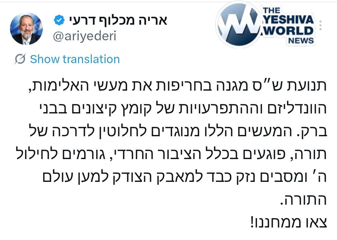 Aryeh Deri: The Shas movement strongly condemns the acts of violence, vandalism, and rioting carried out by a small group of extremists in Bnei Brak. These actions are completely contrary to the path of the Torah, harm the broader chareidi ציבור, cause a Chilul Hashem, and inflict serious damage on the just struggle on behalf of the עולם התורה.