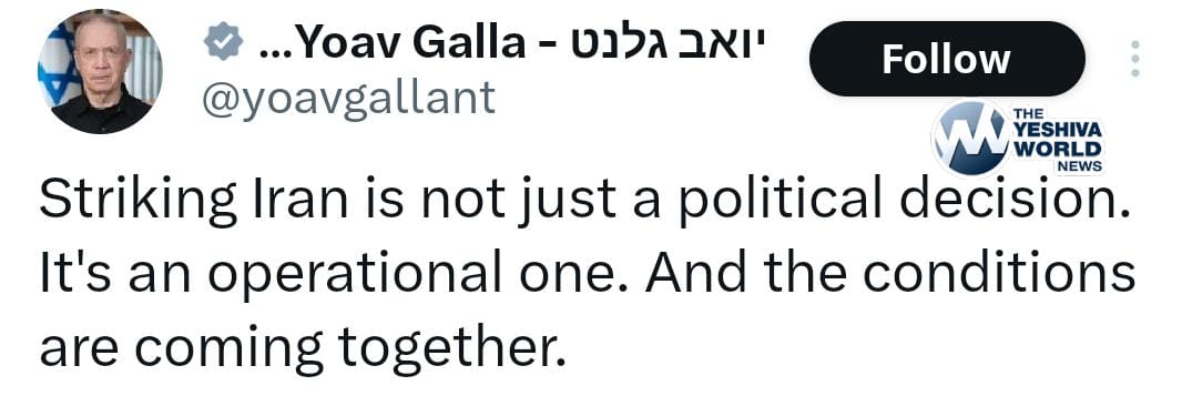 Former Israeli Defense Minister Yoav Gallant: Striking Iran is not just a political decision. It’s an operational one. And the conditions are coming together.