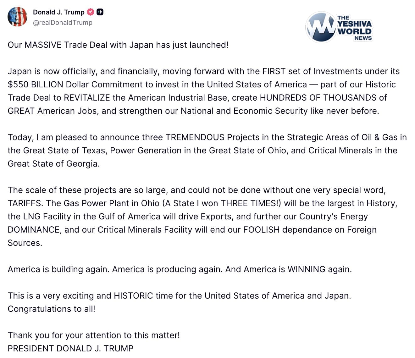 Japan is now officially, and financially, moving forward with the FIRST set of Investments under its $550 BILLION Dollar Commitment to invest in the United States of America — part of our Historic Trade Deal to REVITALIZE the American Industrial Base, create HUNDREDS OF THOUSANDS of GREAT American Jobs, and strengthen our National and Economic Security like never before.