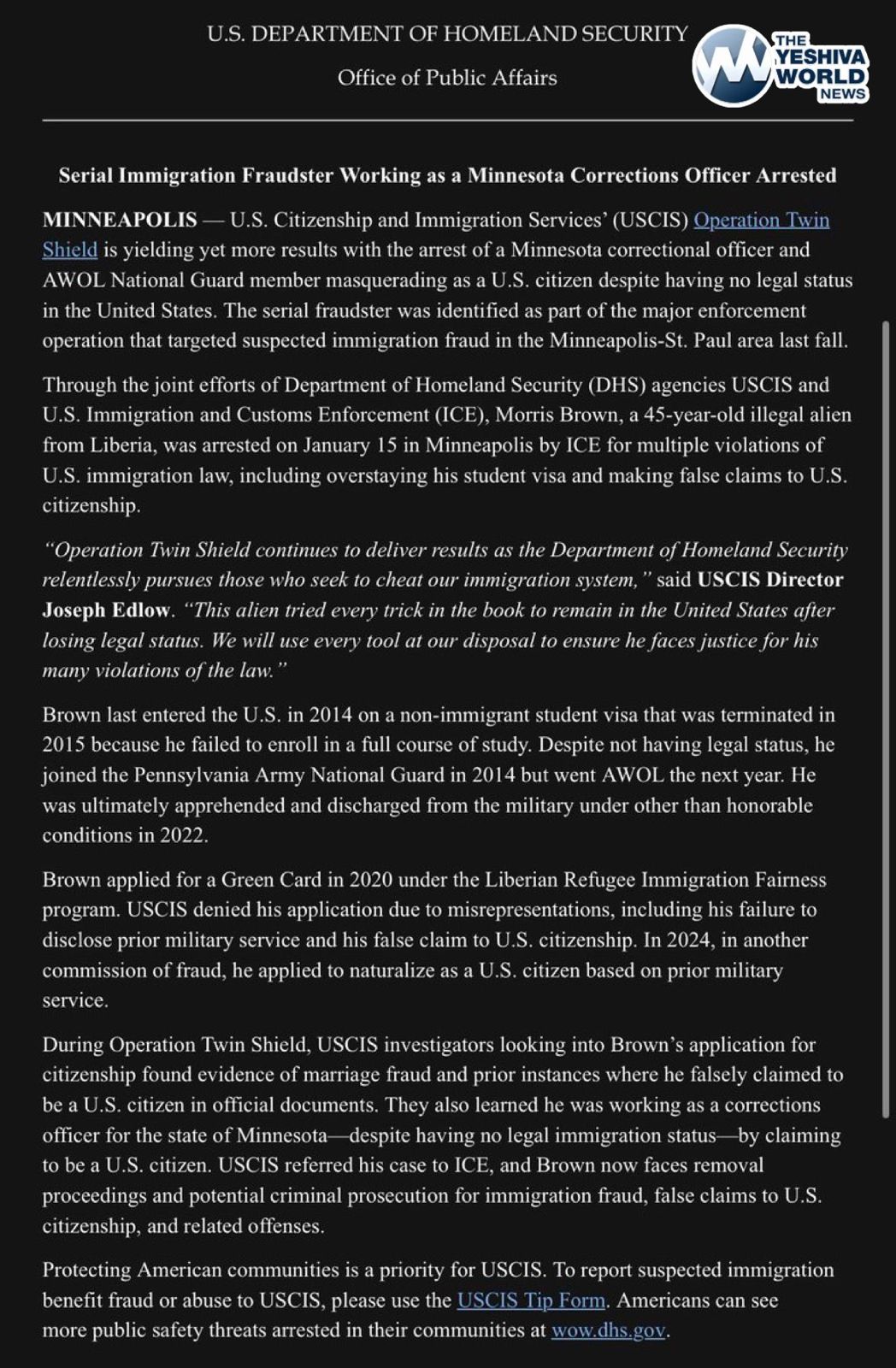 BREAKING: DHS announced the ICE arrest of a Liberian national accused of working as a Minnesota corrections officer while allegedly being AWOL from the Pennsylvania National Guard and falsely posing as a U.S. citizen despite lacking legal status. Authorities say 45-year-old Morris Brown was identified during a major fraud investigation in Minnesota and is also accused of marriage fraud and repeatedly making false statements to U.S. immigration officials.