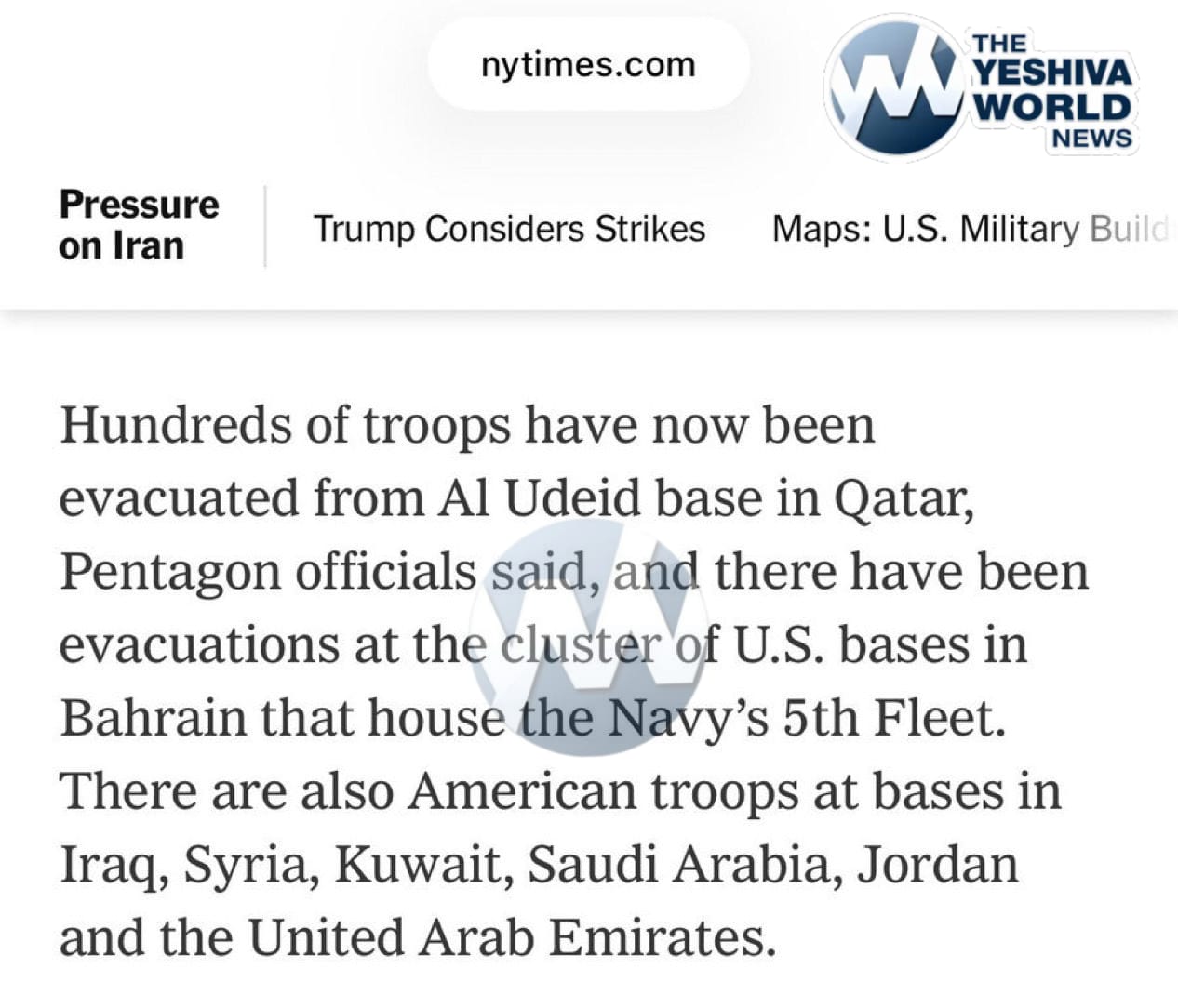 🚨 BREAKING VIA NYT: Hundreds of U.S. troops have been evacuated from Al Udeid Air Base in Qatar, according to Pentagon officials.