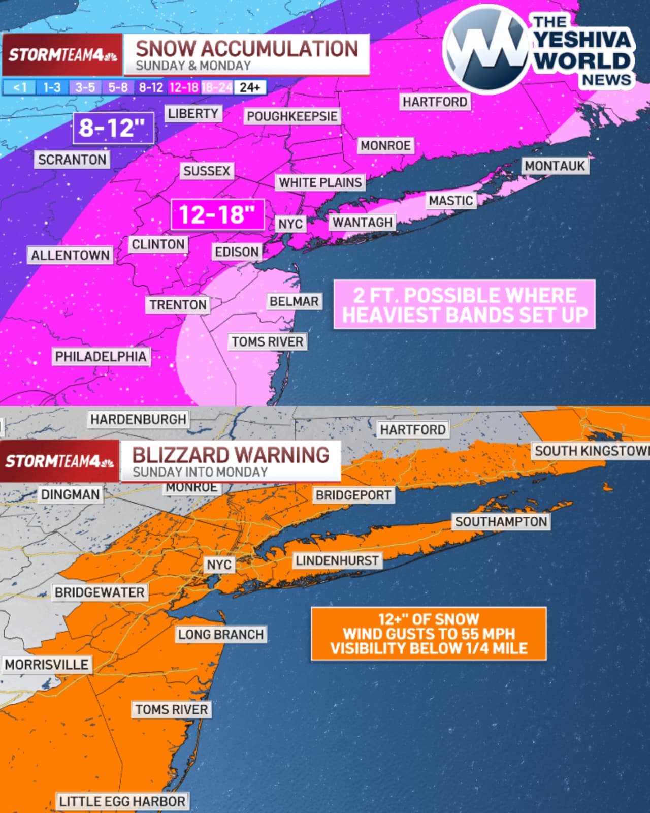 Some farther east on Long Island and down the Jersey Shore could see well more. Maybe even two feet. Totals have significantly shifted for areas north and west, with parts most of Hudson Valley, North Jersey and Connecticut now joining NYC in the 12- to 18-inch range.
