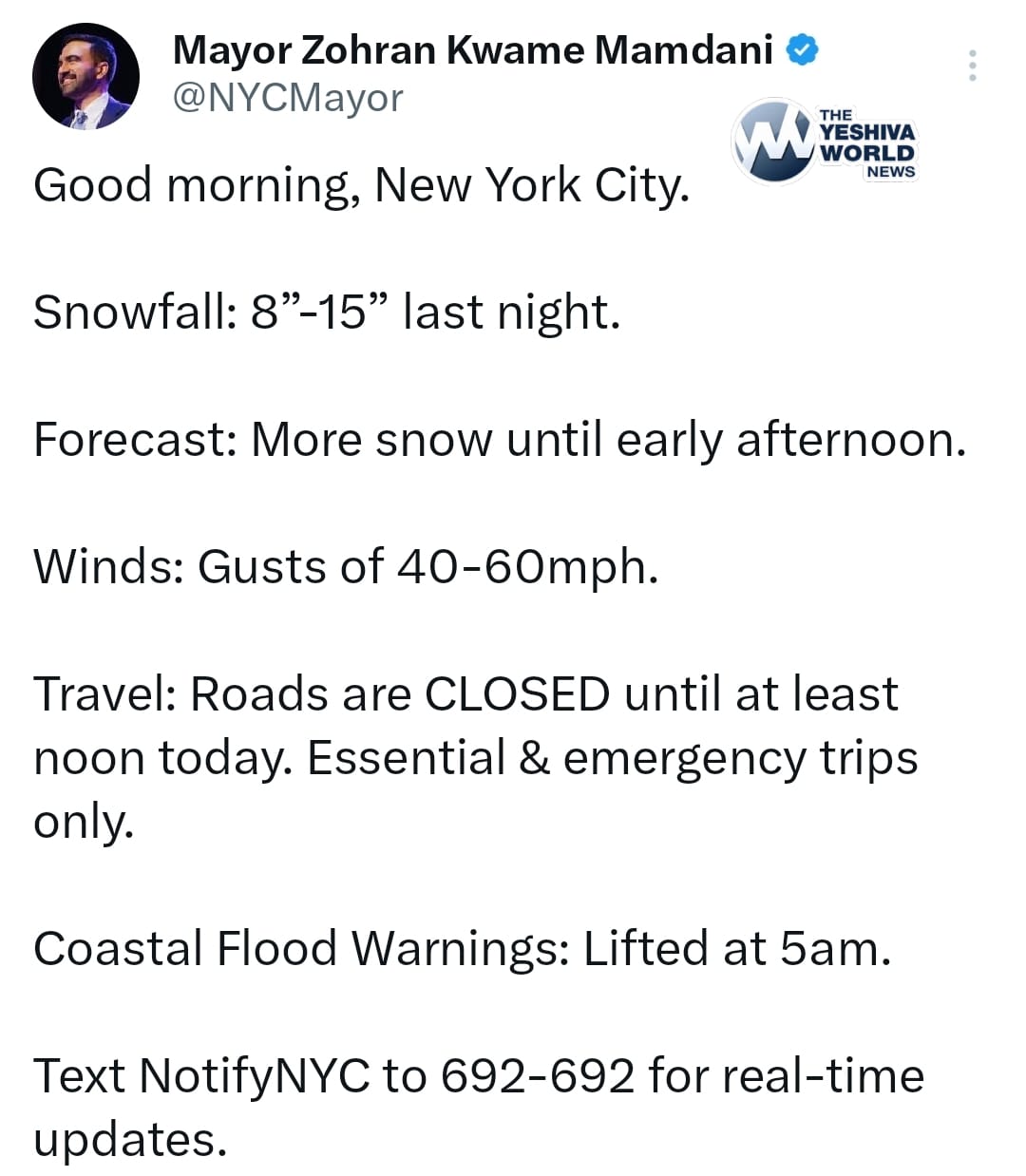 ๐Ÿšจโ„๏ธ Mayor Mamdani announced that travel restrictions have been extended until 12:00 PM due to ongoing hazardous storm conditions.