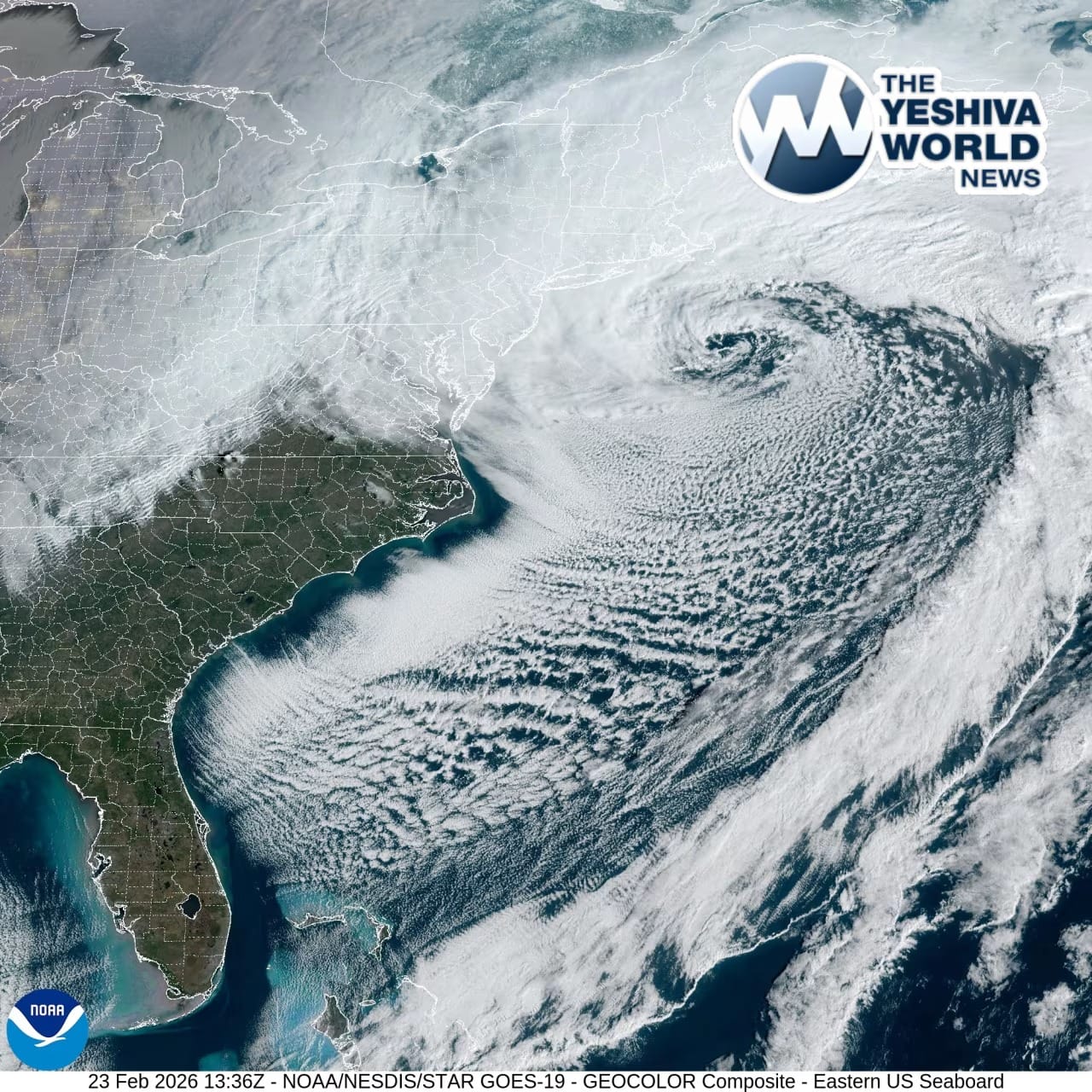 A stunning satellite image shows a textbook norโeaster, with its center clearly visible southeast of New England and classic comma-shaped cloud bands stretching deep into the Atlantic and toward the Bahamas.