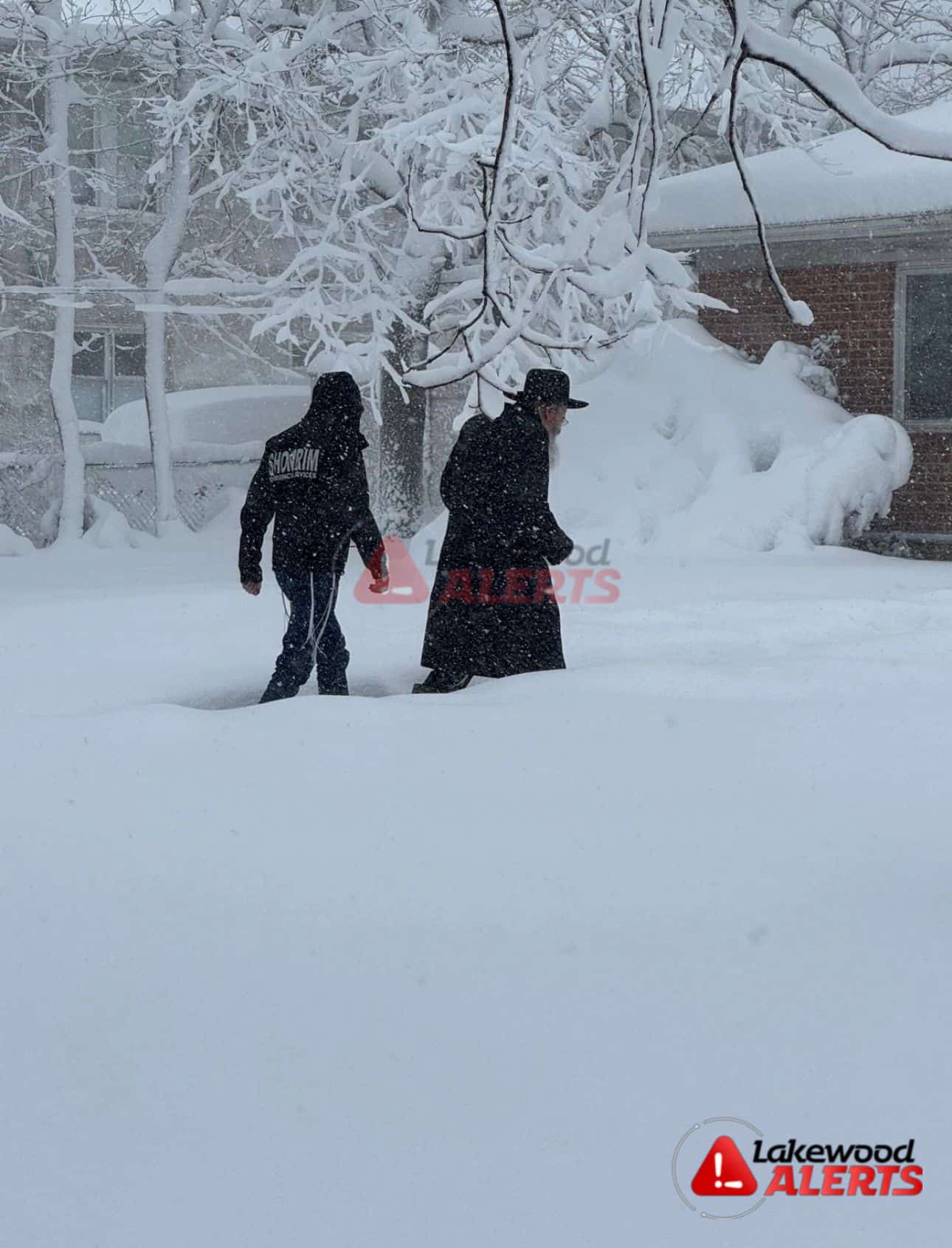 Harav Malkiel Kotler shlit”a being escorted through the snow this morning by a Shomrim volunteer