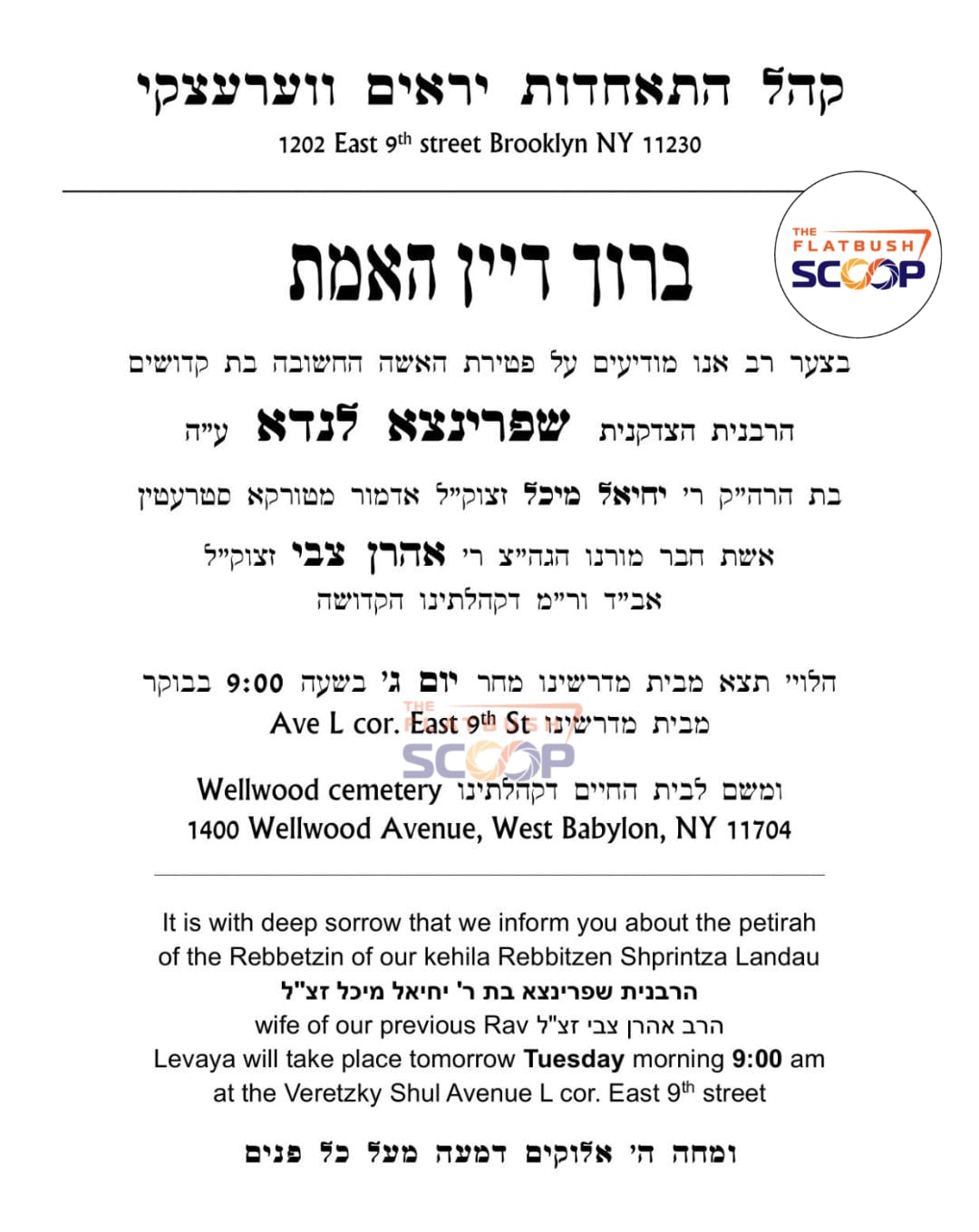 UPDATE: The Levaya of Rebbetzin Shprintza Landau a”h will take place Tuesday morning at 9:00 a.m. at the Veretzky Shul, 1202 East 9th Street (corner of Avenue L) in Flatbush. The Kevurah will follow at Wellwood Cemetery, 1400 Wellwood Avenue, West Babylon, NY 11704. Besuros Tovois!