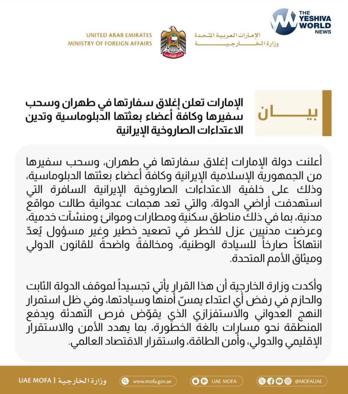 The UAE has closed its embassy in Iran and withdrawn its ambassador along with all diplomatic staff from Tehran in response to the Islamic Republicโs continued missile and drone attacks on the Emirates.