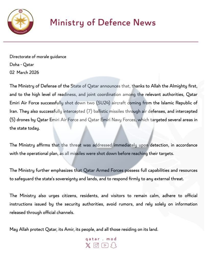 Qatar’s Ministry of Defense reports that its Air Force has shot down 2 Iranian Su-24 aircraft.