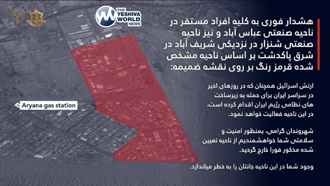 The IDF spokesperson in Arabic issues an evacuation warning for the “Abbas Abad” industrial area and the “Shanzar” industrial area in Tehran.