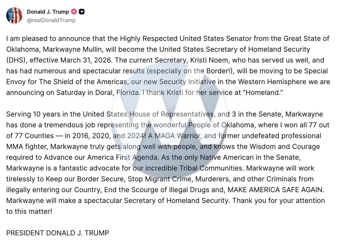 🚨BREAKING: President Trump has fired Homeland Security Secretary Kristi Noem, and is replacing her with Senator Markwayne Mullin of Oklahoma.