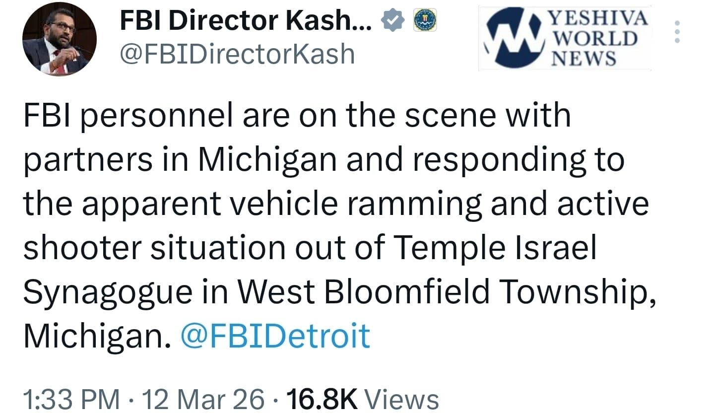 🚨 UPDATE: FBI personnel are responding alongside local law enforcement to an apparent vehicle ramming and active shooter situation at Temple Israel in West Bloomfield Township, Michigan. According to FBI Director Kash Patel, federal agents are on scene with partners in Michigan as the incident unfolds. Authorities have not yet released details on injuries or suspects.