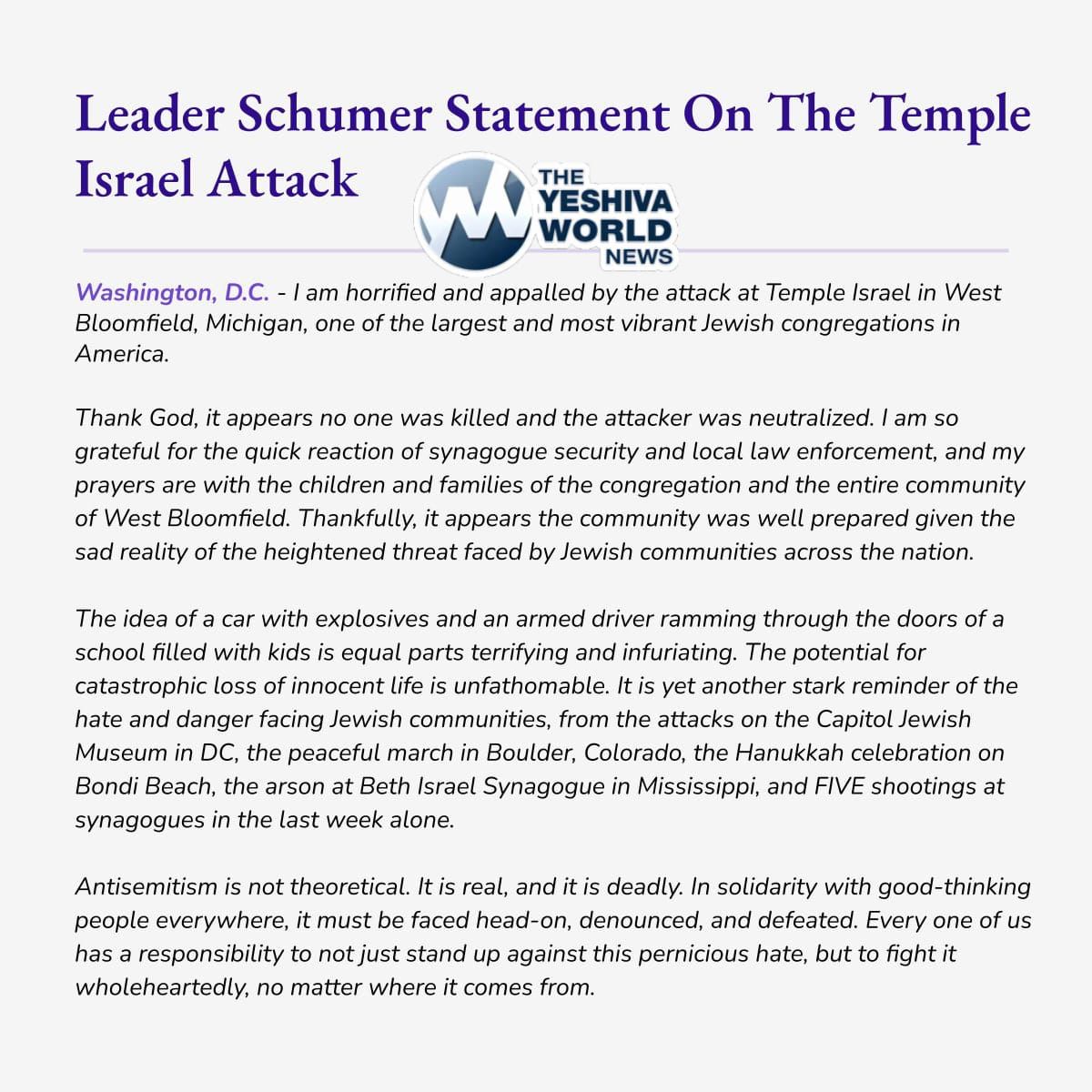 Self-Proclaimed “Shomer Yisroel” Chuck Schumer Issues Statement on West Bloomfield Synagogue Terror Attack