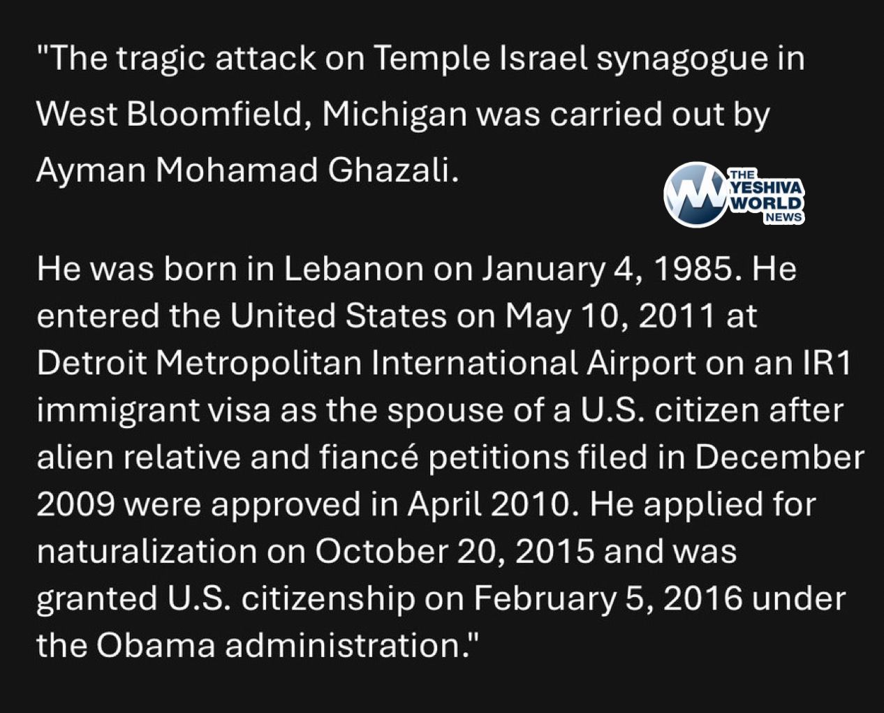🚨 BREAKING: DHS has confirmed that the Michigan synagogue attacker has been identified as Ayman Mohamad Ghazali, a Lebanese national who first entered the United States in 2011 on an IR1 immigrant visa as the spouse of a U.S. citizen. He later became a naturalized U.S. citizen in 2016 during the Obama administration.