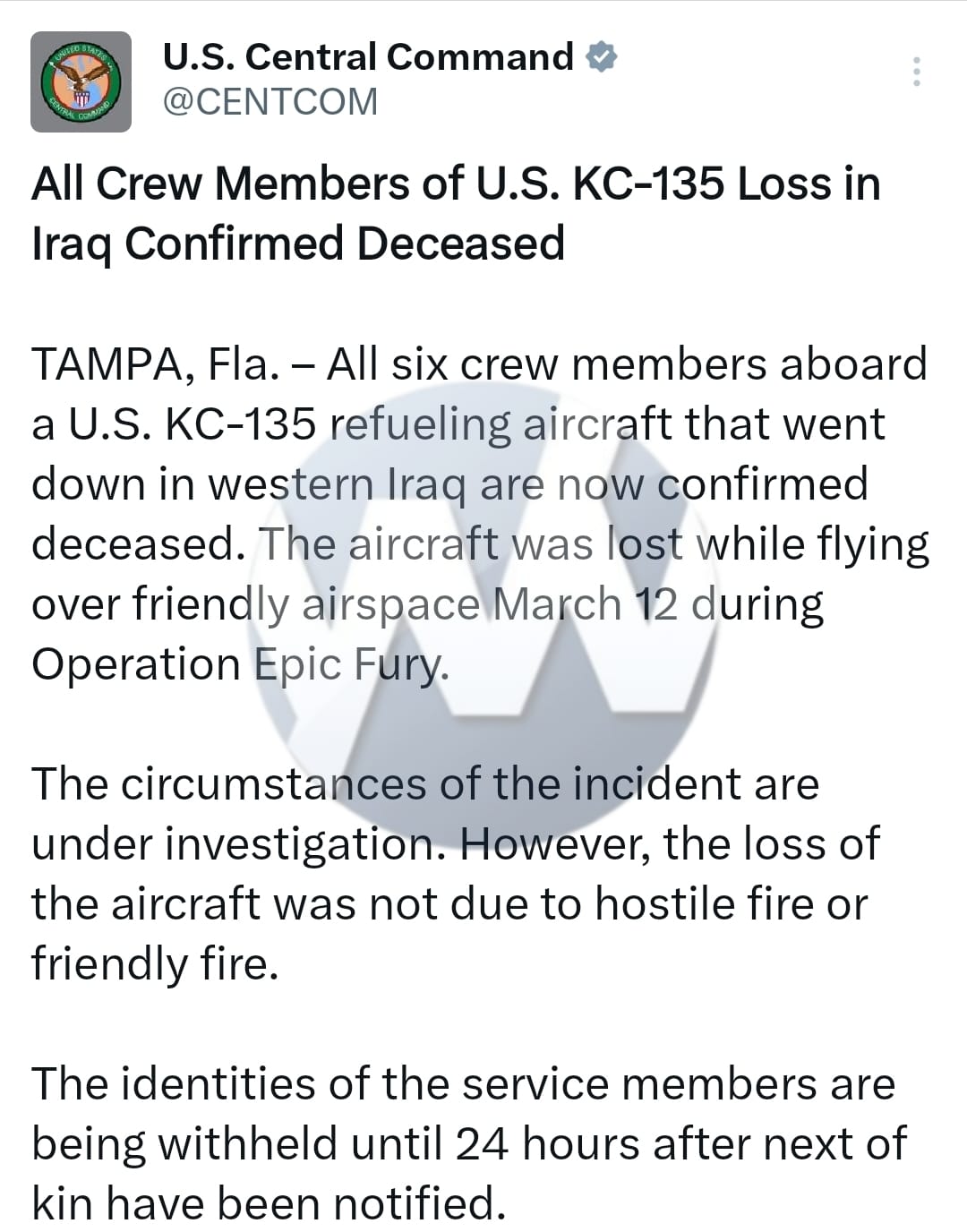 CENTCOM confirms that all six crew members aboard a U.S. KC-135 refueling aircraft that crashed over western Iraq yesterday died in the crash.