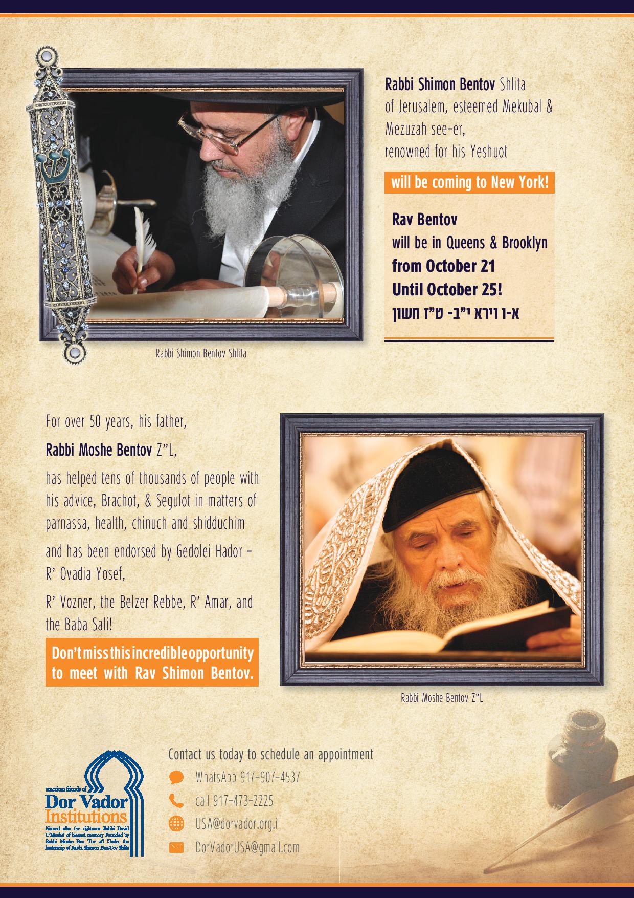 Due to popular demand, Rabbi Shimon Bentov Shlita, a special Mekubal from Jerusalem, the esteemed Mekubal and Mezuzah see-er, the son of Rabbi Moshe Bentov Z”L, will once again be in New York from October 21-October 25.