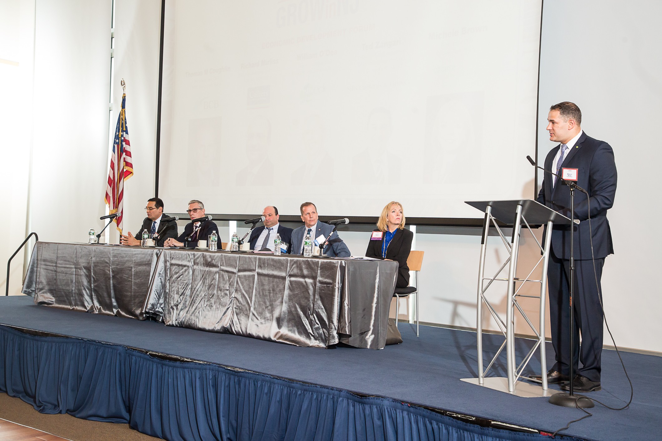 Event Chair, Maksim Sheyn, Senior VP at Investors Bank delivering opening remarks and introducing panelists who are seated L-R, Ted Zangari, Chair of RE Law Dept. at Sills Cummis & Gross; HC Freeholder William O’Dea, Deputy Executive Director at Elizabeth Development Company; Richard Mirliss, Executive Managing Director at Colliers International of NJ; Tom Coughlin, President & CEO of BCB Community Bank; Michele Brown, President & CEO of Choose NJ