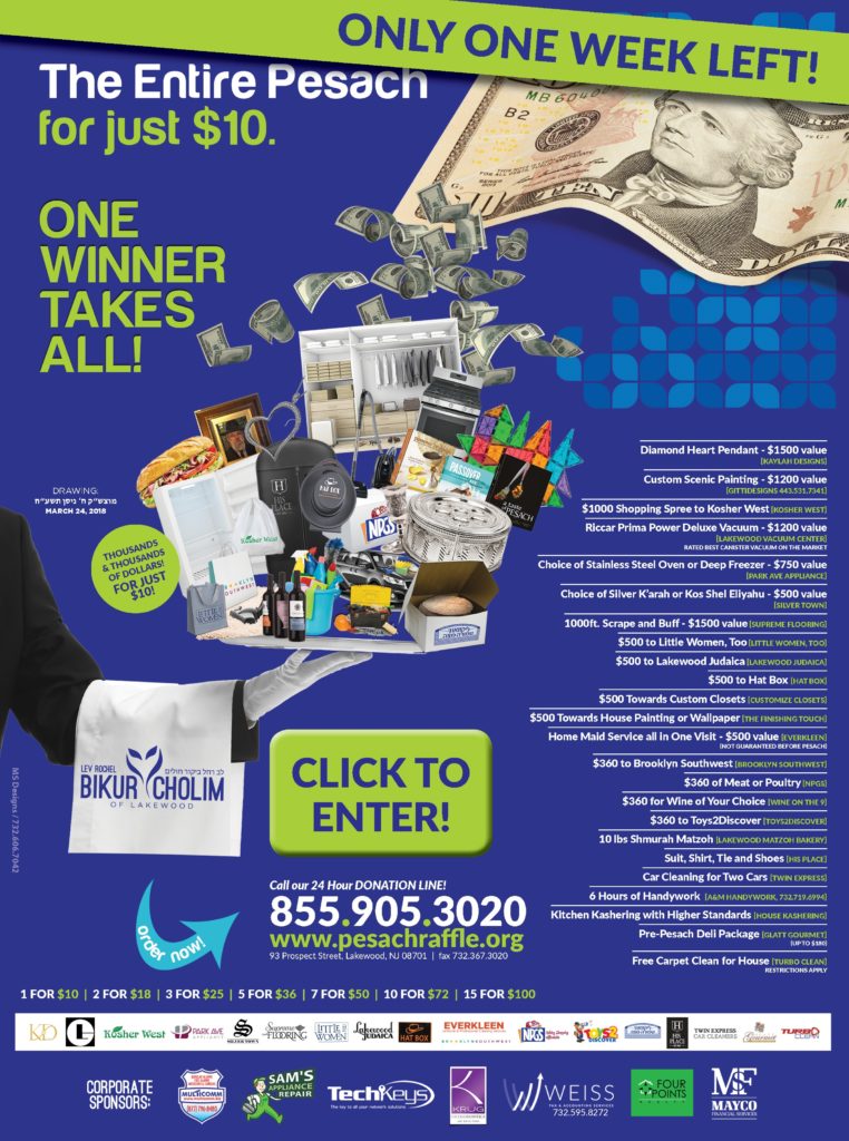The success of our Pesach preparations is a direct result of our “Pesach Raffle”.