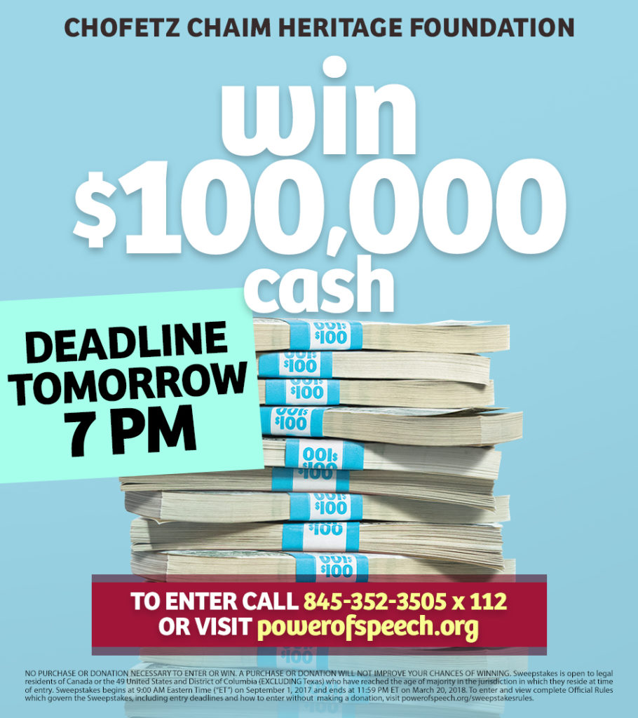 The Chofetz Chaim Heritage Foundation annual raffle, this Wednesday, March 21, gives everyone an opportunity to win $100,000 while gaining the tremendous zechus of helping to build Shmiras Haloshon around the world. For a $100 donation, participants have a chance at the grand cash prize, as well as ten additional prizes.