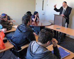 The morning schedule for the Makor students consists of Shacharit together with other YU minyanim, then breakfast, followed by studying alongside mainstream YU students in the Glueck Beit Midrash where they are studying Masechet Sukkah along with the entire yeshiva. With shiur, preparation and review times split into half-hour periods, they put in a solid yet developmentally appropriate morning of Gemara and other religious study.