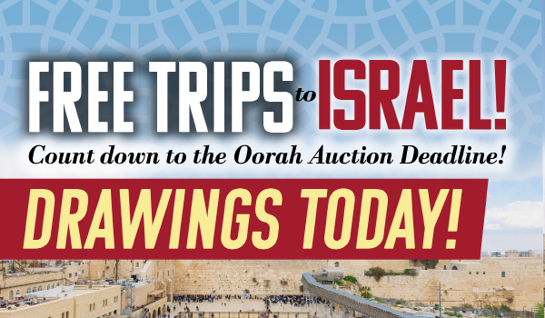 With you Oorah Auction entry, in addition to winning valuable prizes, you’ll be automatically entered into the bonus last chance raffle. Win bonus free trips to Israel! Enter now to win one of 6 tickets drawn throughout the day today, May 8th, from 10 am-10 pm. The earlier you donate, the more chance you have to win!