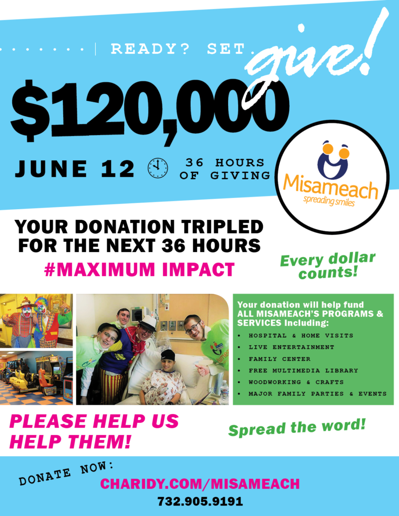Every penny you donate is TRIPLED! For every dollar you give, Misameach will get $3. Every dollar will be matched by our generous benefactors, to help us reach our goal of $120,000.