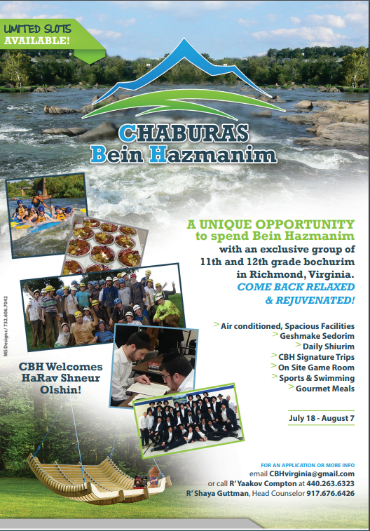 Chaburas Bein Hazmanim is a unique program geared to 11th and 12th grade bochurim run by R’ Yaakov Compton. The CBH program based in Richmond, Virginia, offers geshmake sedorim and shiurim by R’ Compton and R’ Shneur Olshin, competitive sports, as well as an amazing array of signature trips led by the renowned R’ Shaya Guttman. Trips include; caving, jet skiing, natural water slides in the Shenandoah Mountains and many more rare and exciting adventures. See for yourself in this video of Summer 2017!