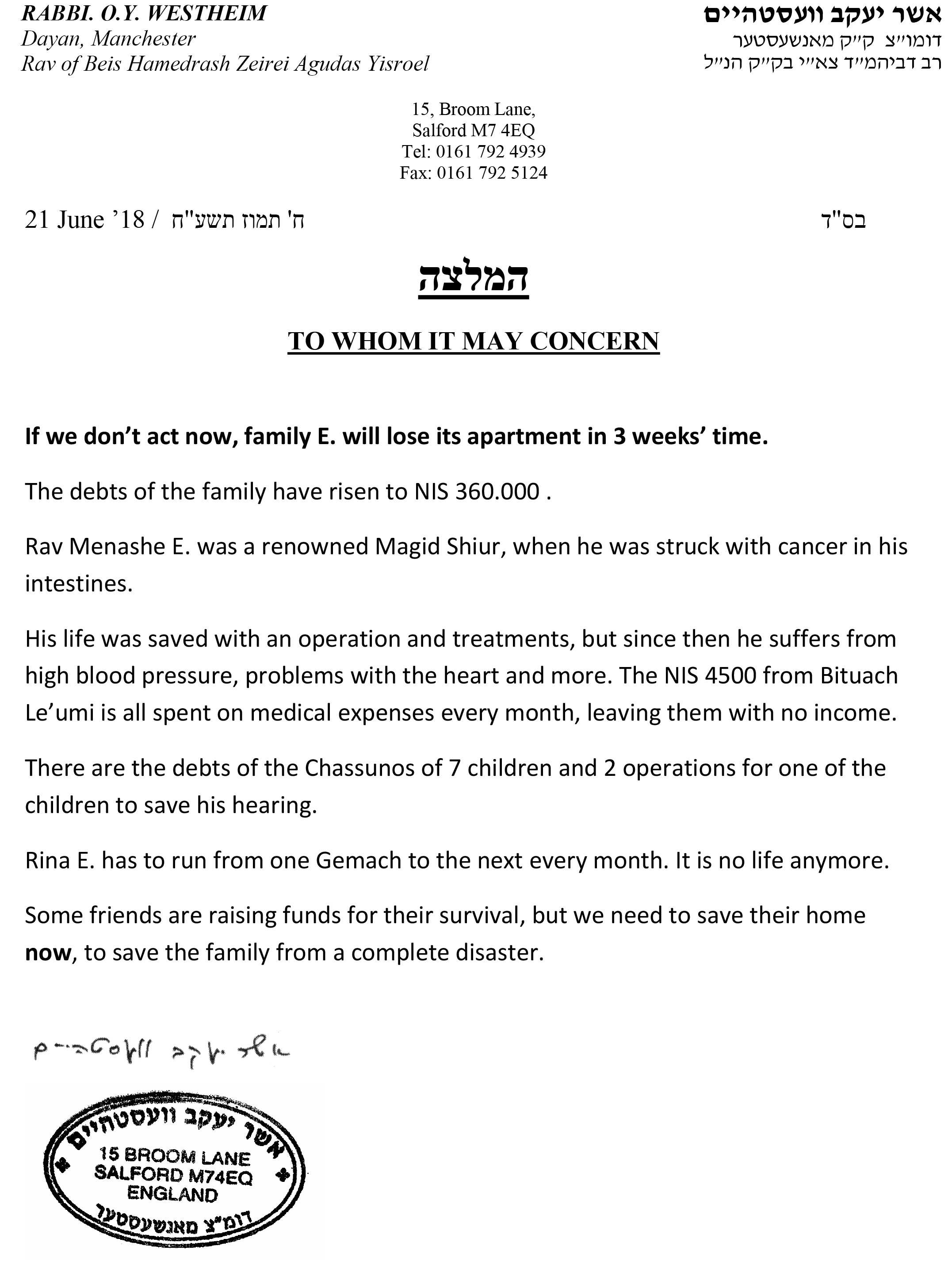 Dear Reader, Rav Menashe came to hospital as a cancer patient in need