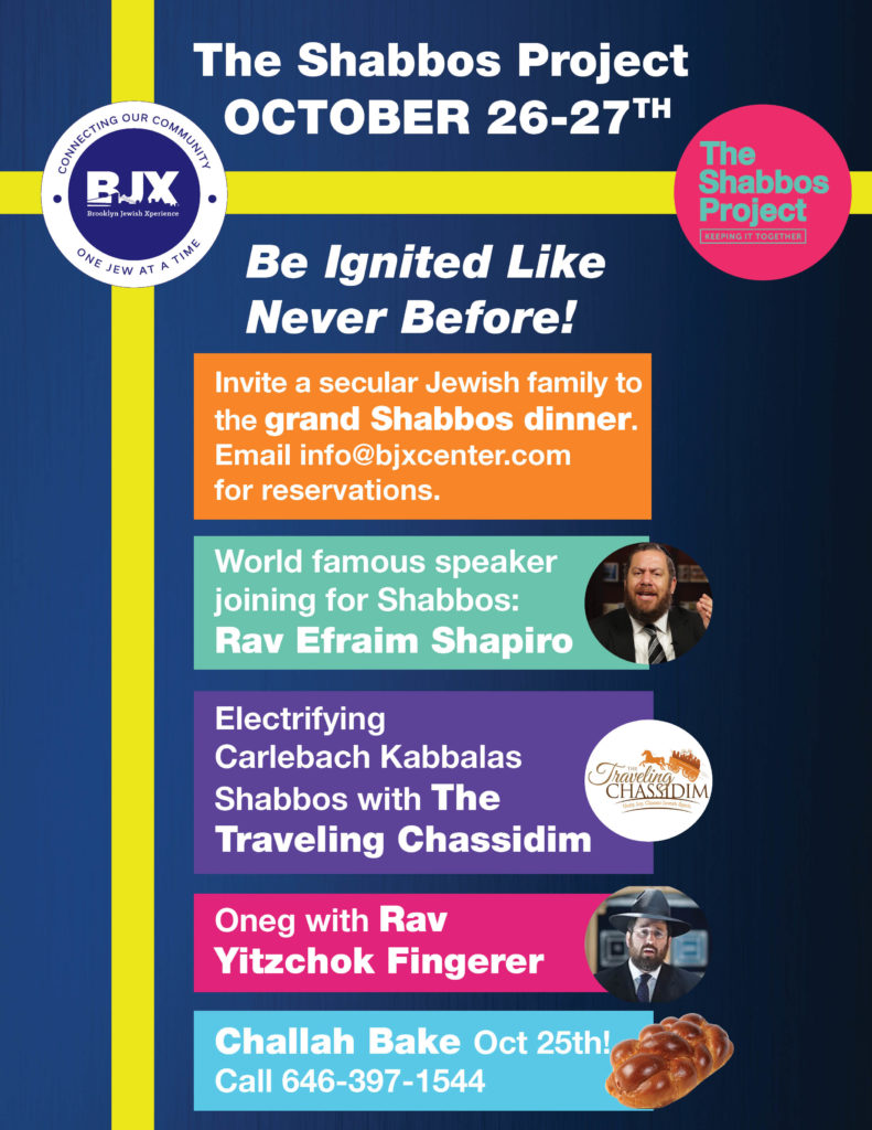 The excitement for the Shabbos Project is growing. “People want to know how they can make a difference and get involved,” says Rabbi Moshe Fingerer, Menahel of BJX. “The people in our community are encouraging other Jews to experience Shabbos,” he said. The Shabbos Project will officially commence Friday evening in typical BJX style with a beautiful and heartfelt Carlebach Kabbolos Shabbos with the Traveling Chassidim. Everyone is encouraged to invite their less affiliated cousin or neighbor to join the grand Friday night Shabbos Project dinner. To make reservations email [email protected]. Space is quickly filling up! Rabbi Ephraim Shapiro of North Miami Beach is joining BJX for Shabbos. He will certainly ignite the pintele yid of the audience throughout this special Shabbos. Rabbi Yitzchok Fingerer, Rav of BJX, will also share words of inspiration and wisdom.The entire community is welcome to join the BJX Shabbos Project Friday night Oneg and the special Shabbos day program. Everyone is also welcome to attend the community-wide Shalosh Seudos which will be enhanced with exciting guest speakers. With all types of Jews unifying together -along with the right balance of inspiration- the BJX Shabbos Project promises to be transformative. It will conclude with a rousing musical Havdalah conducted by the famous Traveling Chassidim. Ladies and gentleman, next Shabbos, Oct 26th, it is time to stop doing and start being. Be that person who picks up the phone and invites someone over to join the Shabbos Project.