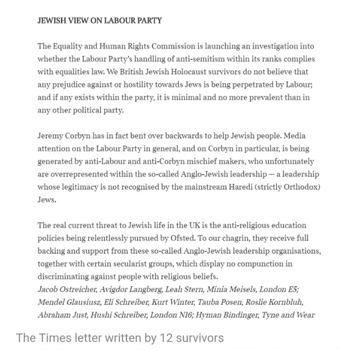 13 holocaust survivors sign letter supporting the embattled Labor leader, Jeremy Corbyn. The noteworthy message was prominently published in the Sunday Times.