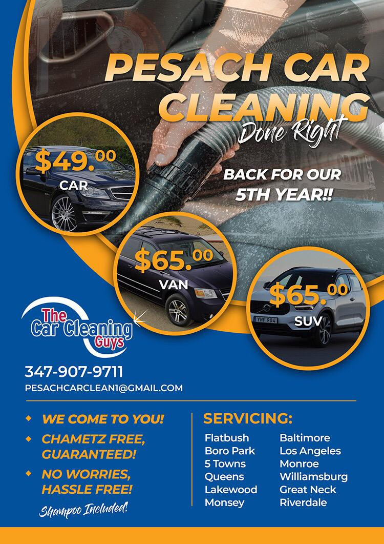 Although the weather is frigid and Purim was just a few days ago , believe it or not Pesach is just around the corner! Homemakers everywhere are starting (or at least thinking about) the cleaning that comes along with the chag. Of all the chores, the one that is most dreaded universally is cleaning the interior of the car. Everyone has those stains and dirt in the interior of the car that just seems impossible to get rid of. The life saver is here: The “Car Cleaning Guys” will do all the work in the interior of the car so you can sit back and relax.FOR INQUIRIES – CALL US AT 347-907-9711 OR EMAIL US AT [email protected]