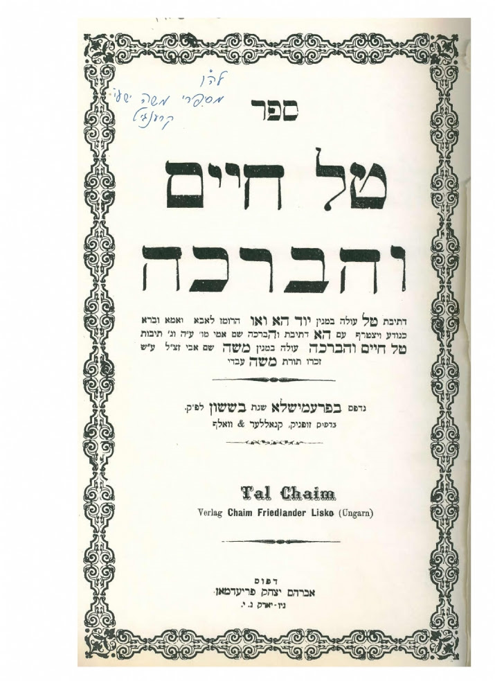 The Tal Chaim was the successor to his father in law Rav Tzvi Hersh of Liska, referred to as the Ach Pri Tevuah and founder of the Liska dynasty.