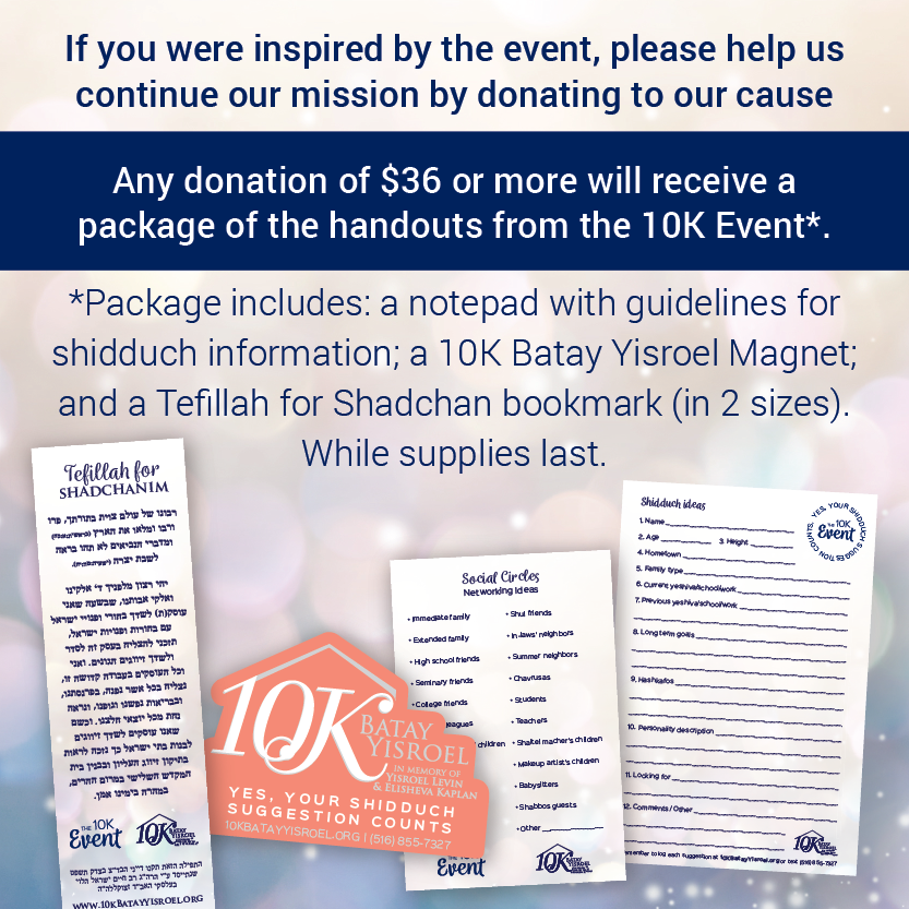 R’ Shaya Levin concluded the evening thanking everyone who worked behind the scenes of the 10K team and then explained his hopes for the future of the organization. He explained, that after this magnificent evening, we will all be inspired to start redting shidduchim. R’ Levin made some practical suggestions in order to facilitate redting shidduchim. Number one, he recommended that one take on a shidduch “chavrusa” or “partner” in order to: keep each other accountable; help each other out; and to provide encouragement. Number two, if a person has any questions about the process of redting shidduchim, R’ Levin suggested reaching out to 10K by email in order to be paired up with a seasoned Shadchan who can serve as a mentor. Finally, R’ Levin announced his fervent wish that the 10K website will serve as a bulletin board for shidduch meetings around the world. The 10K Shidduch Groups were a huge success in the Catskills Mountains last summer and R’ Levin asked that we bring that success to cities everywhere. Anyone interested in hosting a shidduch meeting is encouraged to visit 10KBatayYisroel.org and register their 10K Group so that it can be listed there for others to join.