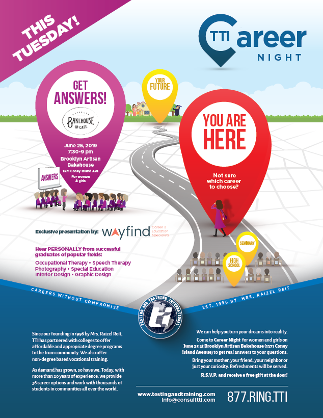 Raizel Reit, a mother and activist in our community, saw the need for more guidance. Today, she hosts a Career Night under the umbrella of her company, TTI, for these women at the close of the school year. Girls and their mothers, their friends and family members can learn about the most current career opportunities attractive to women today. The program includes presentations of the fields available to a woman, and the processes of reaching those goals. Only fields that are appropriate to the Bas Yisroel of today are discussed, and pathways that are acceptable are recommended. Exclusive presentations by successful graduates of various fields such as Graphic Design, Interior Design, Speech Language Pathology, Occupational Therapy and Special Education will be given, in addition to a mini-career counseling workshop by the popular WayFind duo, in this way fully addressing a young woman’s needs.
