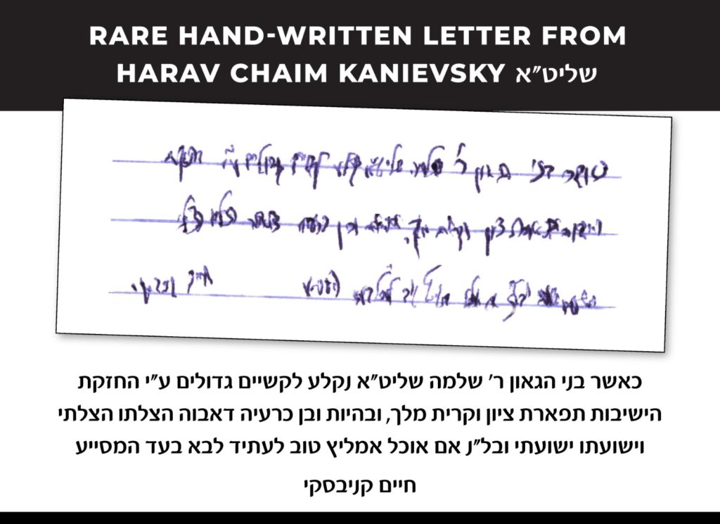 Rav Chaim has released a very powerful letter, which he himself wrote, in which he describes the importance of helping save the yeshiva: “My son, Hagaon Rav Shlomo shlit”a, is experiencing tremendous anguish due to the running of the yeshivos, Tiferes Tzion and Kiryas Melech, and since [as Chazal say] ben kara d’avuha, a son is an extension of his father, [Rav Shlomo’s] salvation is my salvation and [Rav Shlomo’s] yeshuah is my yeshuah.” Furthermore, Rav Chaim said that he will, bli neder, if he is able, “serve as an emissary in the future on behalf of those who contribute [to this effort].”