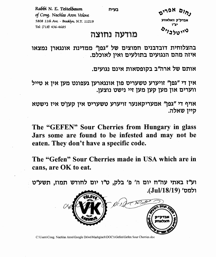 The same applies to fresh cherries. American cherries are sprayed, and have no problem, but European cherries, especially from Eastern Europe, are heavily infested and each cherry must be checked.
